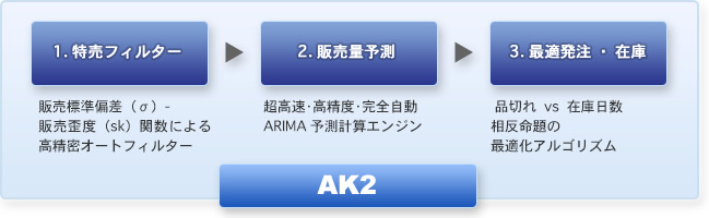 発注量を人的な経験や予想に頼るのではなく、時系列解析モデル(ARIMAモデル)による販売予測量を用いて、飛躍的に発注精度を高めるシステムです。